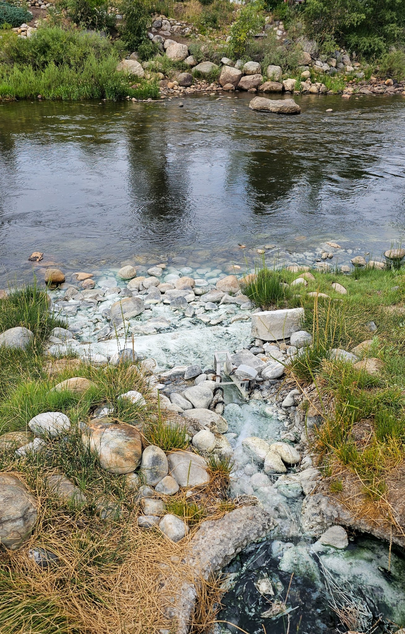 Was wie übelste Umweltverschmutzung aussieht sind mineralische Ablagerungen der Quellen hier. Begleitet wird das Wasser vom Duft des Schwefelwasserstoffs … natürlich in geringer Konzentration, weil sonst geht es in Richtung faule Eier und ist giftig (sagt man).
