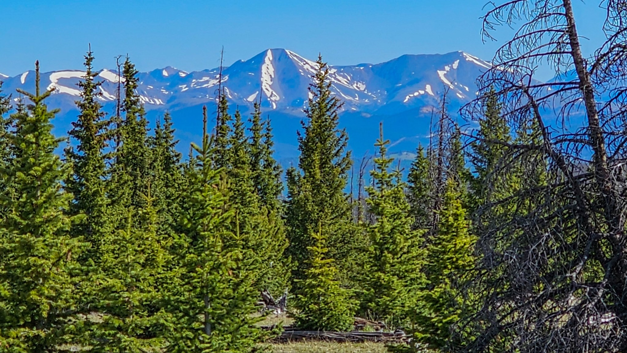 Das „Mittelgebirge“ langweilt langsam etwas. Da zeigte mir der Gott des Weges die Zukunft. 😊 Dort hinten in den Bergen geht es in drei Tagen weiter. (Morgen nach Salida und ein Zero-day.)