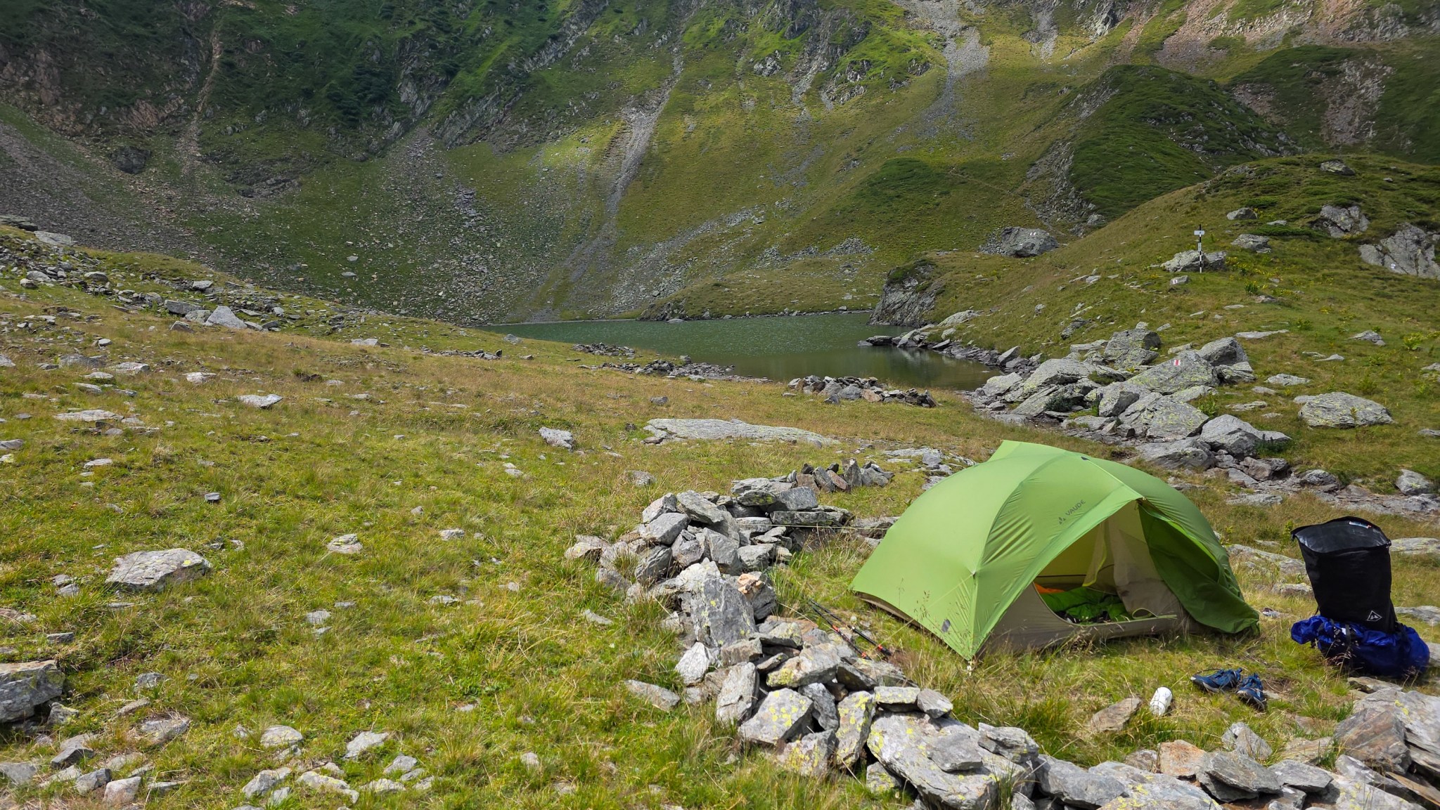 He egal, der Tag geht halt geil zu Ende. Konnte alles trocknen, ich war schwimmen auf 2060 m, sitze an einem Tisch mit rumänischen Köstlichkeiten und meine Lampe wird aufgeladen, die mir den Weg zum trocknen Schlafsack zeigen wird. 😍